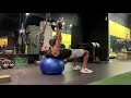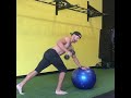 Standing in a split stance position with opposite side hand on the ball, make sure majority of your weight is on your front foot. Perform a row with rotation make sure your head follows the movement. Do not go into lumbar extension, the majority of your rotation should be coming from your thoraic.