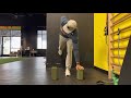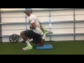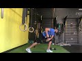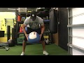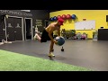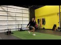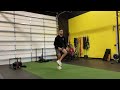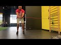 Wrapping a band around a kettle bell, perform a retro walk loading the back heal, rotating pelvis. Weight should be 80-20 with 80 being on the back heal. As you reach the weight down, pull the band maintaining this position, then starting over in the first position.